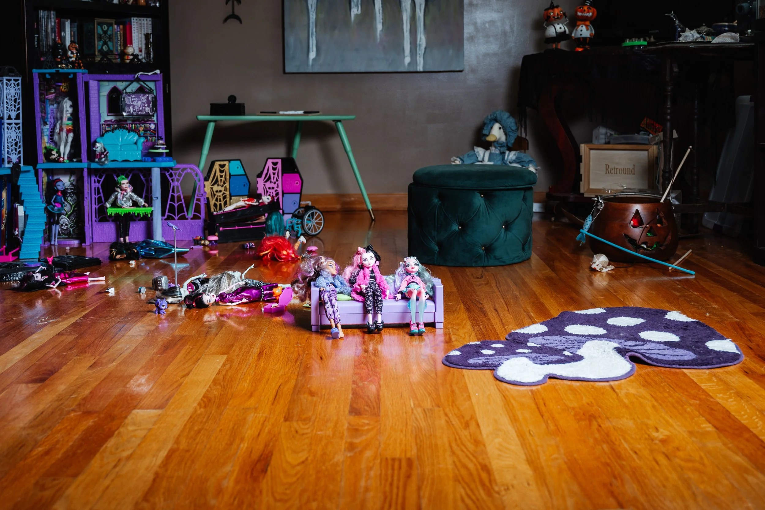 Inside, the house reveals itself like a magically dwelt den, dim, layered, and gentle, like stepping into a cozy cave stitched together from oddities, and nostalgia. The front room is where their love of art, creatures, and all things spooky comes alive: a curated collection of books and trinkets, a soft-lit altar, and a full Monster High shrine, castle and coffins included.