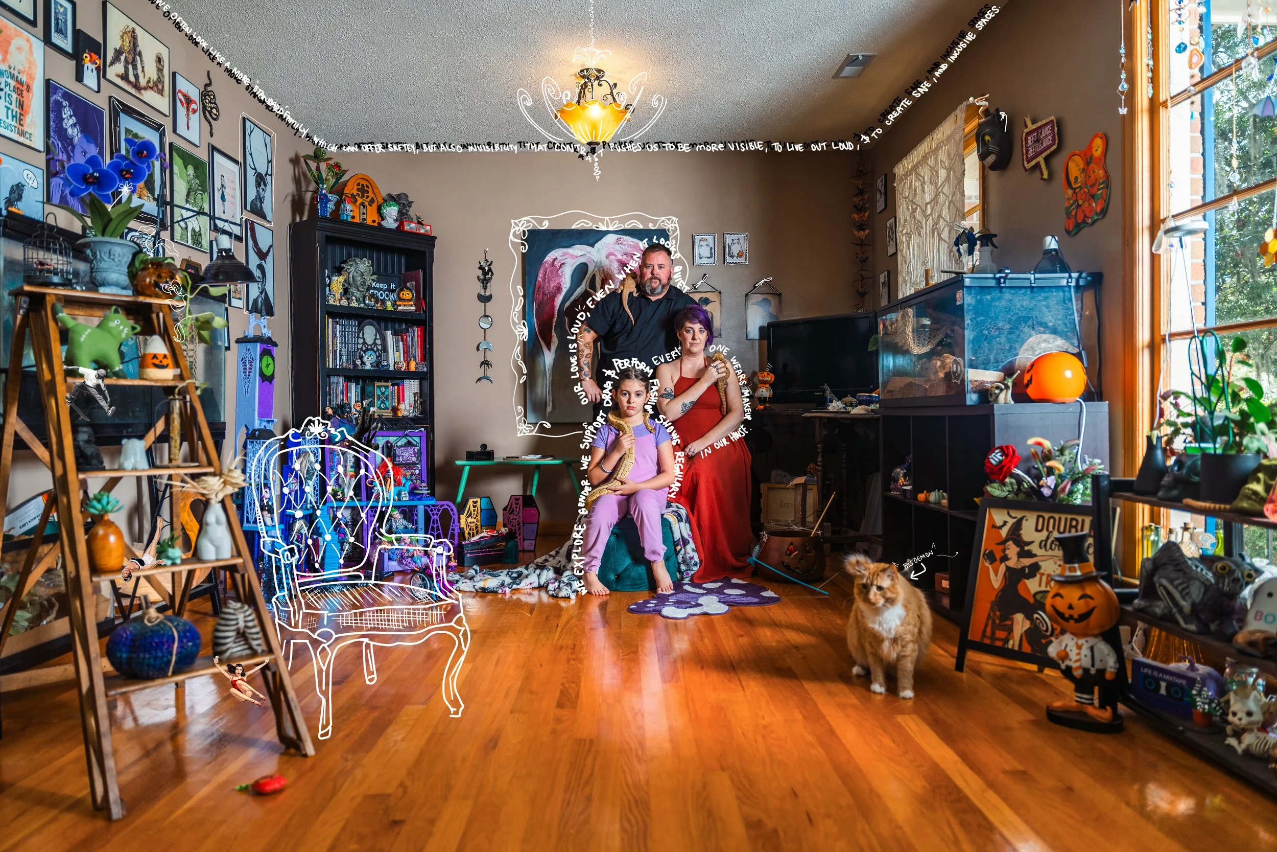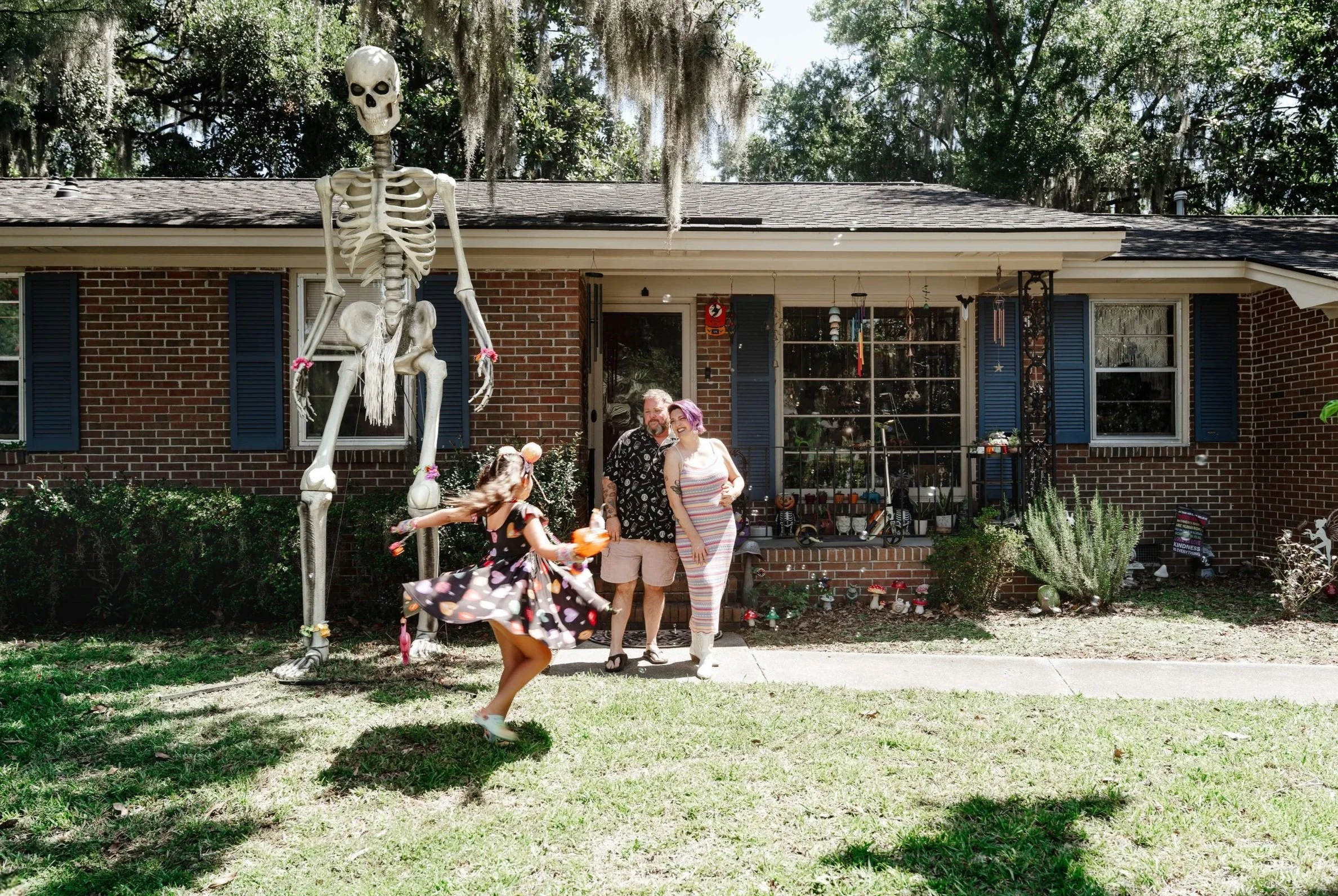 This is a queer family in the South, moving through visibility, passing, and pride with both contrast and courage. Their front yard is watched over by a towering skeleton named John, a campy, welcoming feature that greets visitors year-round and hints at the playful spookiness within. This home is a space of emotional safety and playful experimentation, where gender is a spectrum, everyone wears makeup, and brinner (breakfast for dinner) is sacred. It’s a space where Talia, 8, can grow into herself without judgment, a safe space where the message is clear: You can always come home.